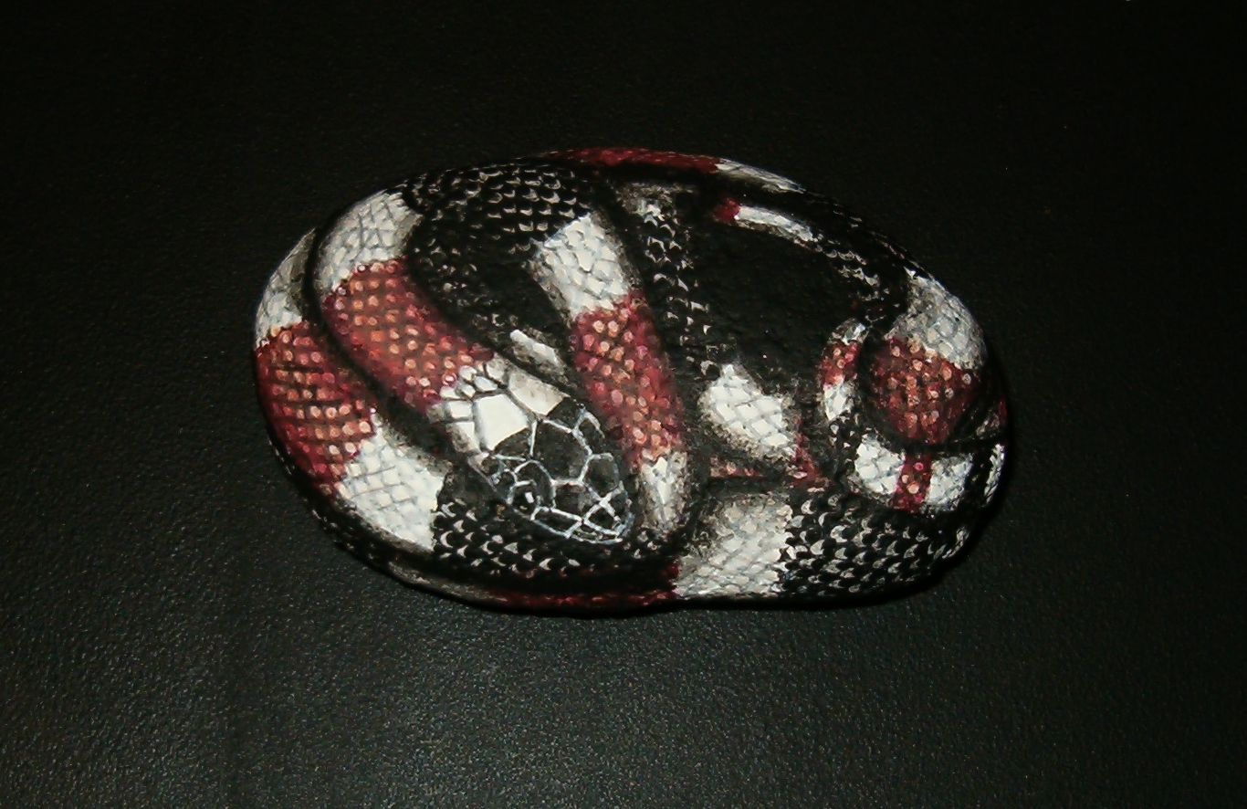 I was a perfectionist in the past when it came to creative endeavours. I always paid very close attention to every detail trying to make them perfect. Being a perfectionist can be a good thing, but it can also slow you down or keep you from even trying new things. I have written before about being a slow painter. Part of this is because I keep seeing little things that aren’t quite right so I have to “fix” them. I’ve also said that I started painting snakes because I could not paint fur – especially when I was trying to paint every individual hair. Fur is better done by painters who can relax and feel free in their brush strokes. I tend to want to control it all -v e r y c a r e f u l l y. My perfectionism isn’t just a problem with painting. It is also a problem with cake decorating – especially when you are working commercially and quantity, not quality is preferred. I struggled mightily for quite awhile, trying to make quality cakes but not having enough time to do it. The only way to keep up was to lower my standards and that was difficult. I realized that my standards had nothing to do with the store’s standards and since the store was paying me, I needed to lower my standards to meet theirs. That was when I learned the phrase, “It’s good enough.” For awhile I had to keep repeating it to myself whenever I put a cake out in the case. After awhile I got used to it and it has helped me with my painting. For example – this coral snake that I painted is “good enough” – it is not my best and I am a bit frustrated with it, but I got to the point where I just had to quit. Sometimes trying to “fix” something only makes it worse. And what I find funny is that at times it’s the “good enough” item that people want, not the “perfectionist” item. The cake with realistic roses in a variety of soft hues will sit in the case for days – and the cake that I threw together in five minutes with leftover frosting and sprinkles is bought minutes after I put it out. I guess that means that my “good enough” can be someone else’s “perfect.” That is actually nice to know.
